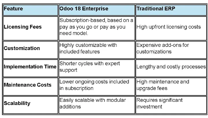 Odoo 18 Enterprise offers significant cost savings compared to traditional ERP solutions: